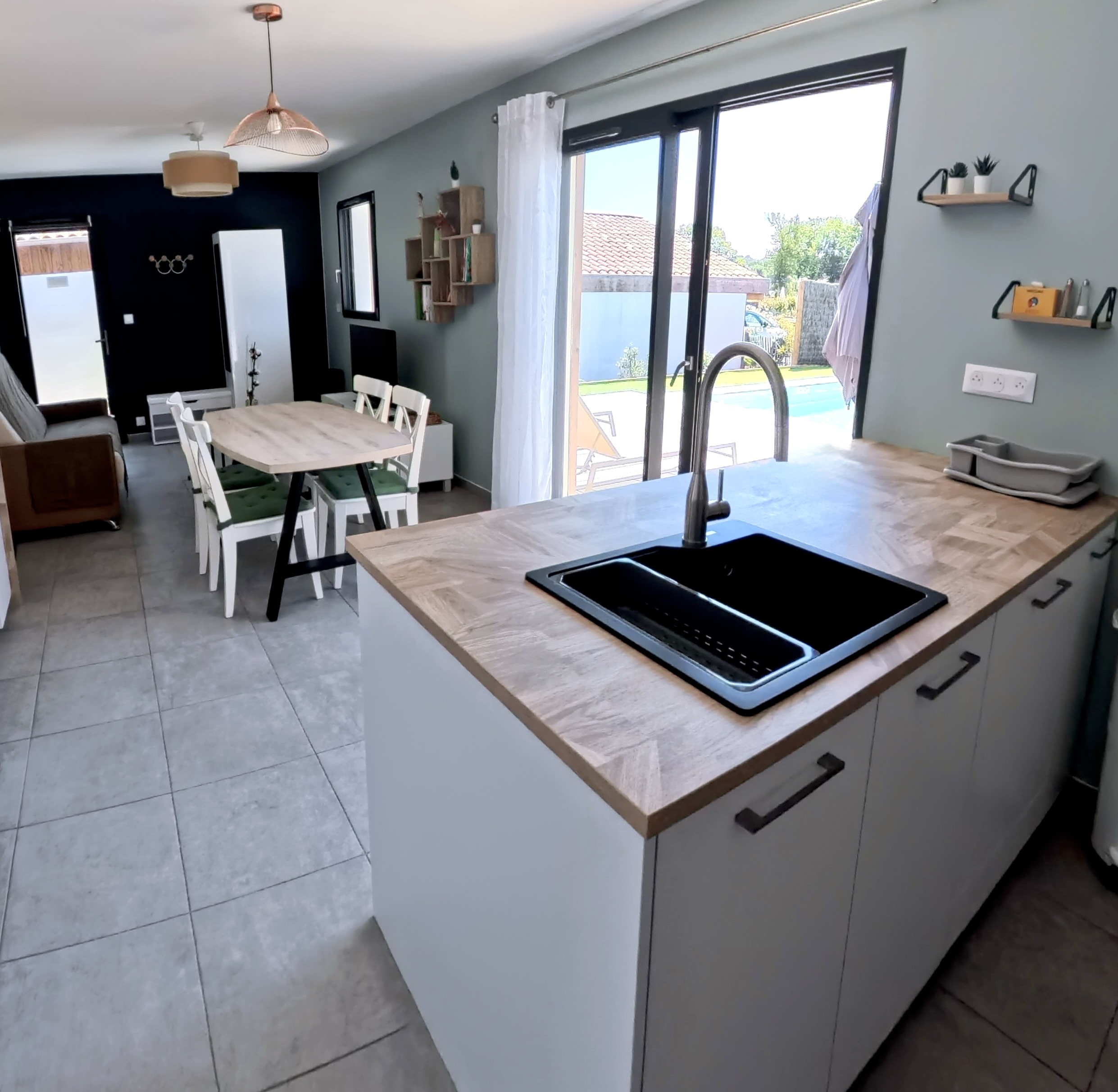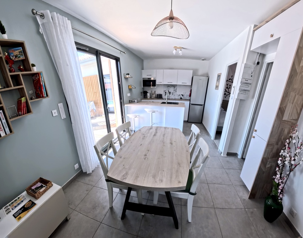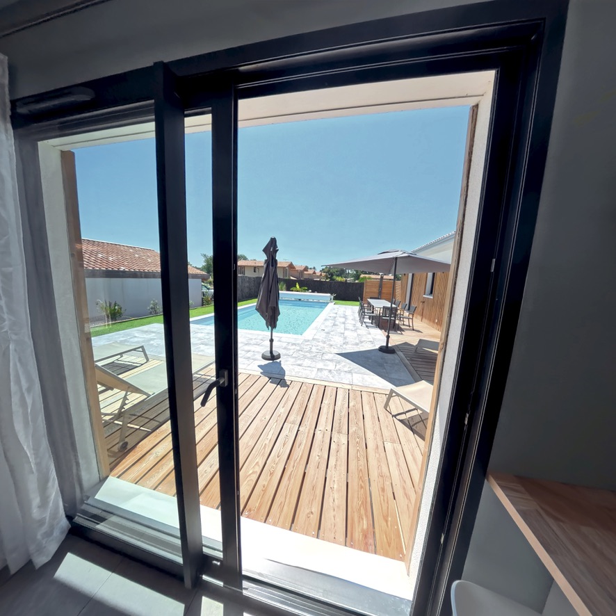 Cet espace donne accès à la terrasse et à la piscine